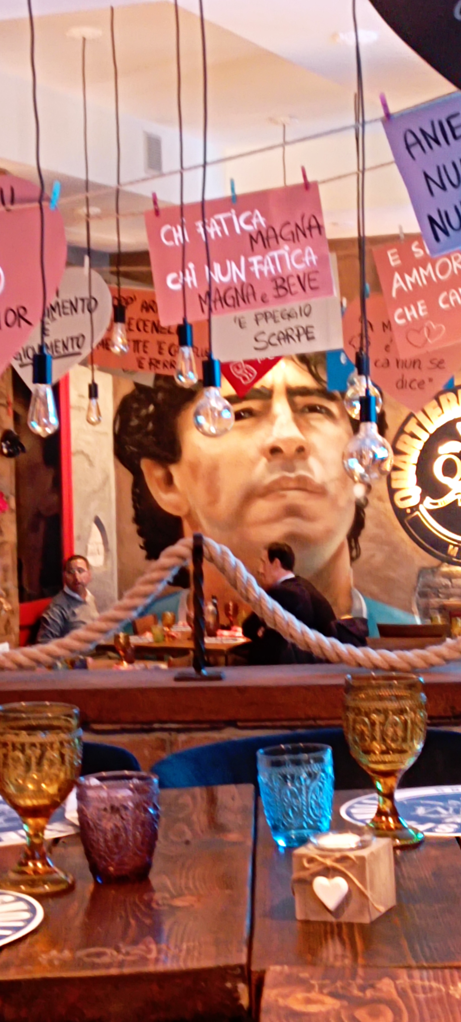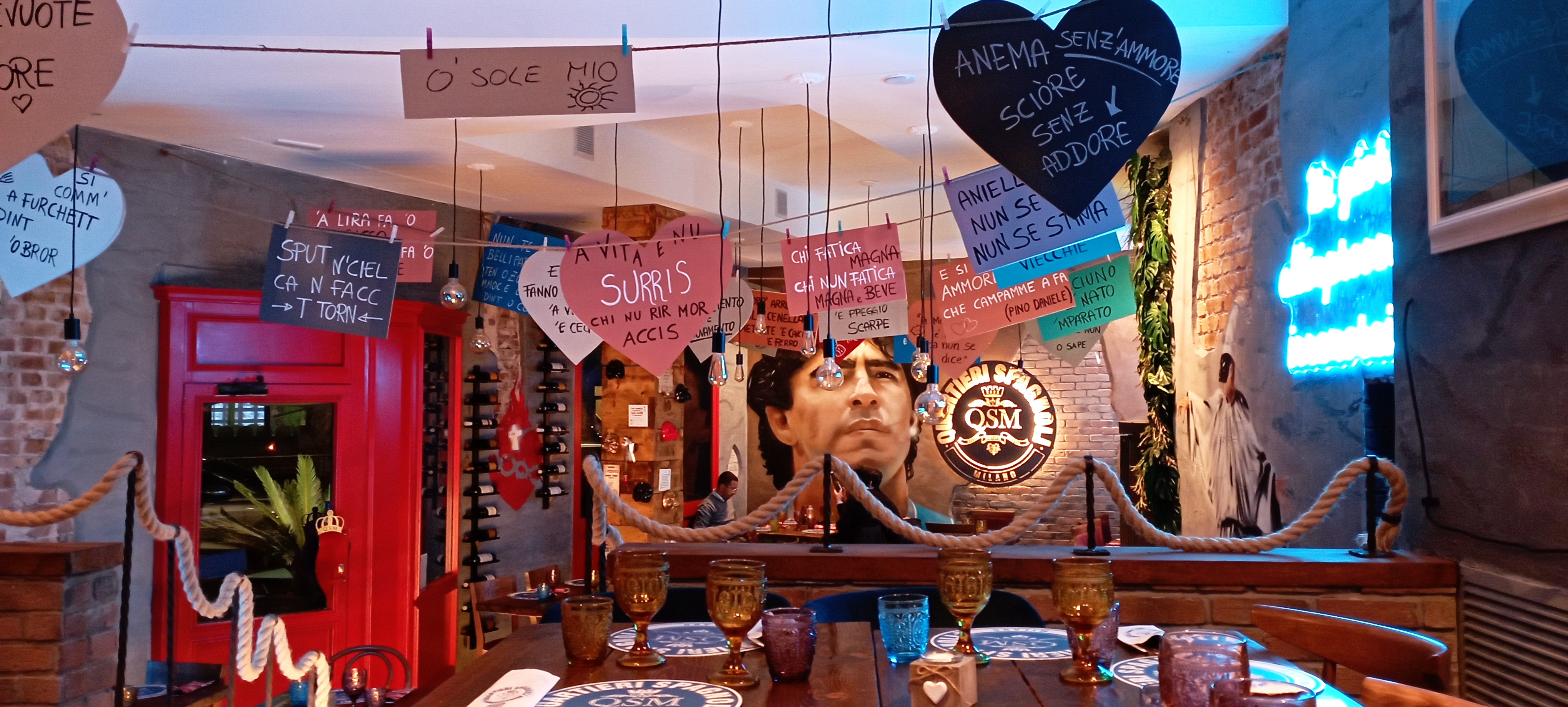 Se dopo aver librato tutto il giorno avete deciso di andare a sentire il figlio di Pino e vi è venuta una gran voglia di Napoli, dovete solo prendere un tram (il 12 o il 14 per la precisione) e scendere alla fermata via Cenisio via Induno. All’altezza del civico 19 di Cenisio, è aperto da giugno un ristorante pizzeria, Quartieri spagnoli. Entrare è come fare una full immersion in Partenope. Ma davvero eh, la maniglia della porta è un grande curniciello rosso vivo, e appene dentro…La meraviglia. Vi accoglierà una cameriera sorridente, che è sempre un bel biglietto da visita, in un mare di colori, su un muro c’è il faccione della mano de dios, su un altro c’è Sofia, dal soffitto scendono fumetti con le più belle e famose frasi che si usano sotto il Vesuvio e la voce dei neomelodici. L’apoteosi però si raggiunge quando vi arriva davanti la pizza, pasta lievitata oltre le 24 ore, fiordilattte o bufala, corrnicione – e quando dico one lo dico sul serio – con o senza ripieno. O se preferite, fritti cuoppi primi e secondi. La pasticceria è quella di Sal de Riso, i piatti, una volta svuotati si rivelano quasi da eposizione, un tripudio di colori e limoni che a guardarli ti sembra di essere in Costiera. Non vi chiedo di fidarvi così a caso, l’invito è quello di seguire i due consigli letterarculinari. Sono sicurissima che poi verrete a dirmi che bella domenica avete passato.