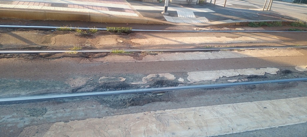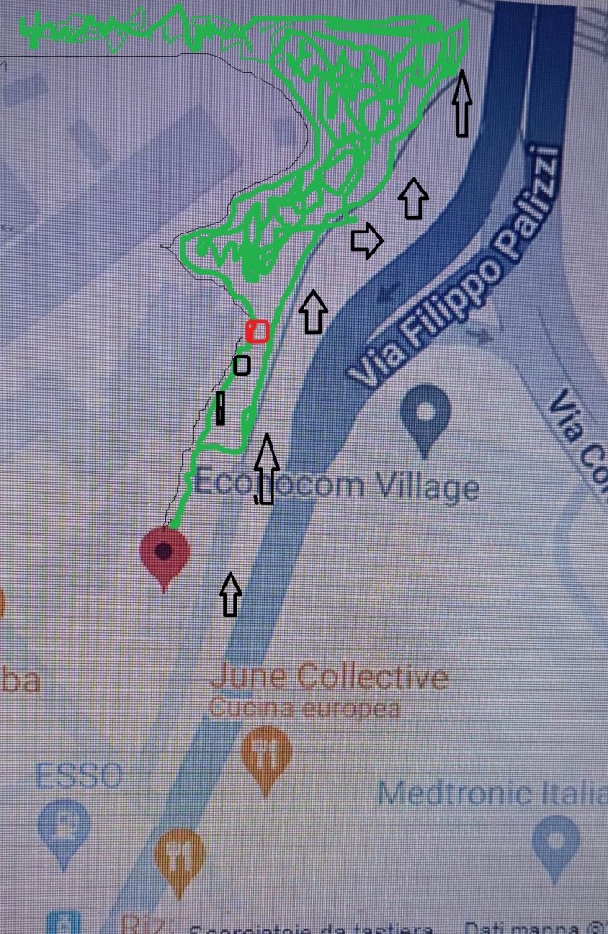 Piccola legenda esplicativa: la stradina chiara che parte di fronte al distributore, è la parte incriminata di via Palizzi. Le frecce indicano la porzione di strada dove sono posizionati i binari del tram. A un livello più basso (un paio di metri) inizia la zona verde. I tre quadratini sono gli ex orti comunali (al momento occupati da rom) mentre in quello rosso, è ospitata una colonia felina, che con la collaborazione del comune e dei volontari, stiamo catturando e sterilizzando. In verde, la giungla.